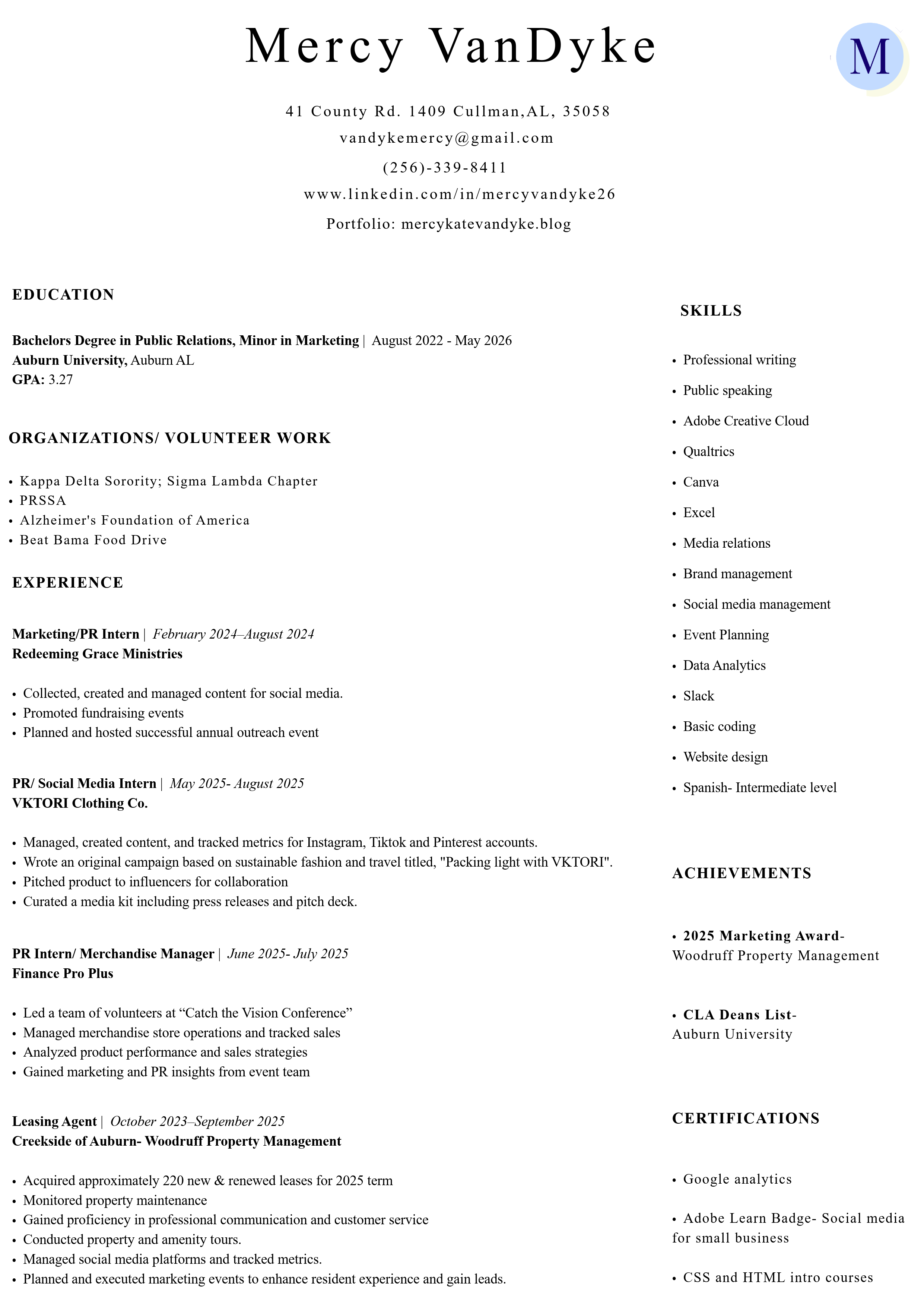 As a senior at Auburn University, majoring in public relations with a minor in marketing, I’m passionate about facilitating meaningful connections between brands and their audiences. I see myself stepping into a career where I can bring corporate events to life, manage engaging social media strategies, and lead campaigns with honesty and freshness. I love blending creative vision with strategic planning. Whether I’m crafting a campaign, writing a press release, or designing engaging graphics, I aim to create experiences that resonate, inspire, and encourage participation.